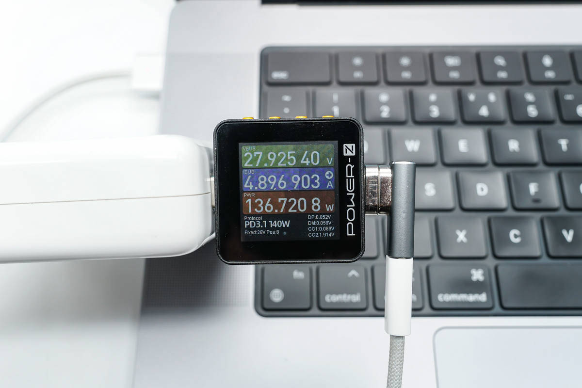 심지어... 140W 고속 충전도 지원하고 어댑터는 Apple의 140W 질화갈륨 충전기와 MagSafe 3 고속 충전 케이블에 연결됩니다. 이때 충전 전압은 28V, 전력은 135.72W이다.