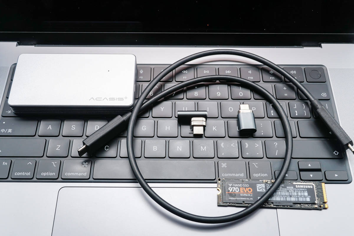 다음으로 데이터 전송 테스트를 살펴보겠습니다. 사용된 도구는 Samsung 970 EVO 솔리드 스테이트 드라이브, Thunderbolt 3 하드 디스크 상자, Thunderbolt 3 데이터 케이블 및 2개의 어댑터입니다.
